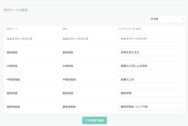 2.「特定ワードの設定」より、変更したい表示名を入力し「この内容で保存」をクリックします。