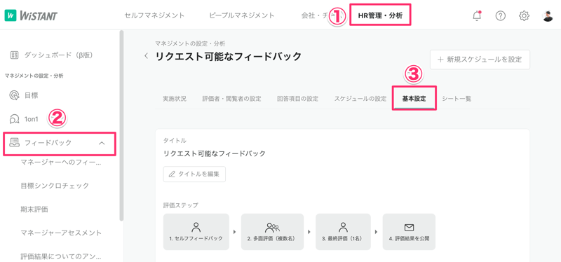 1.「HR管理・分析」→「フィードバック」→表示をカスタマイズしたいフィードバックを選択→「基本設定」をクリック